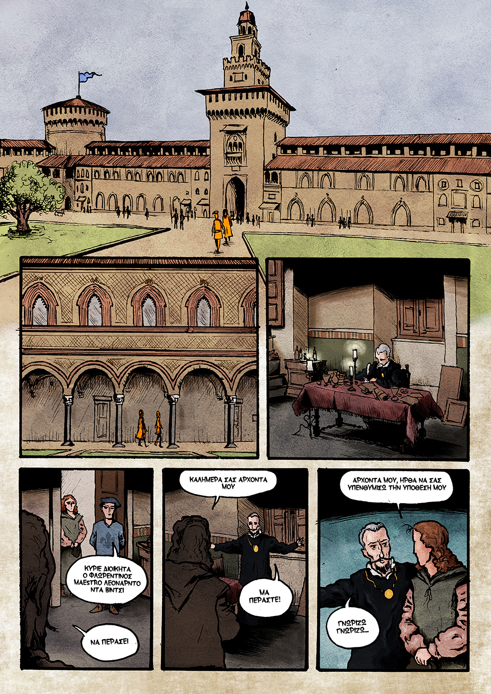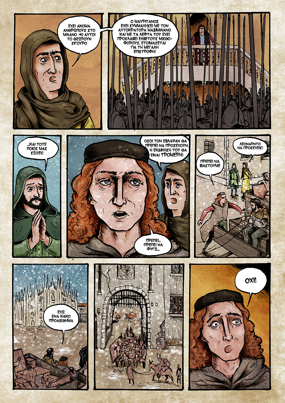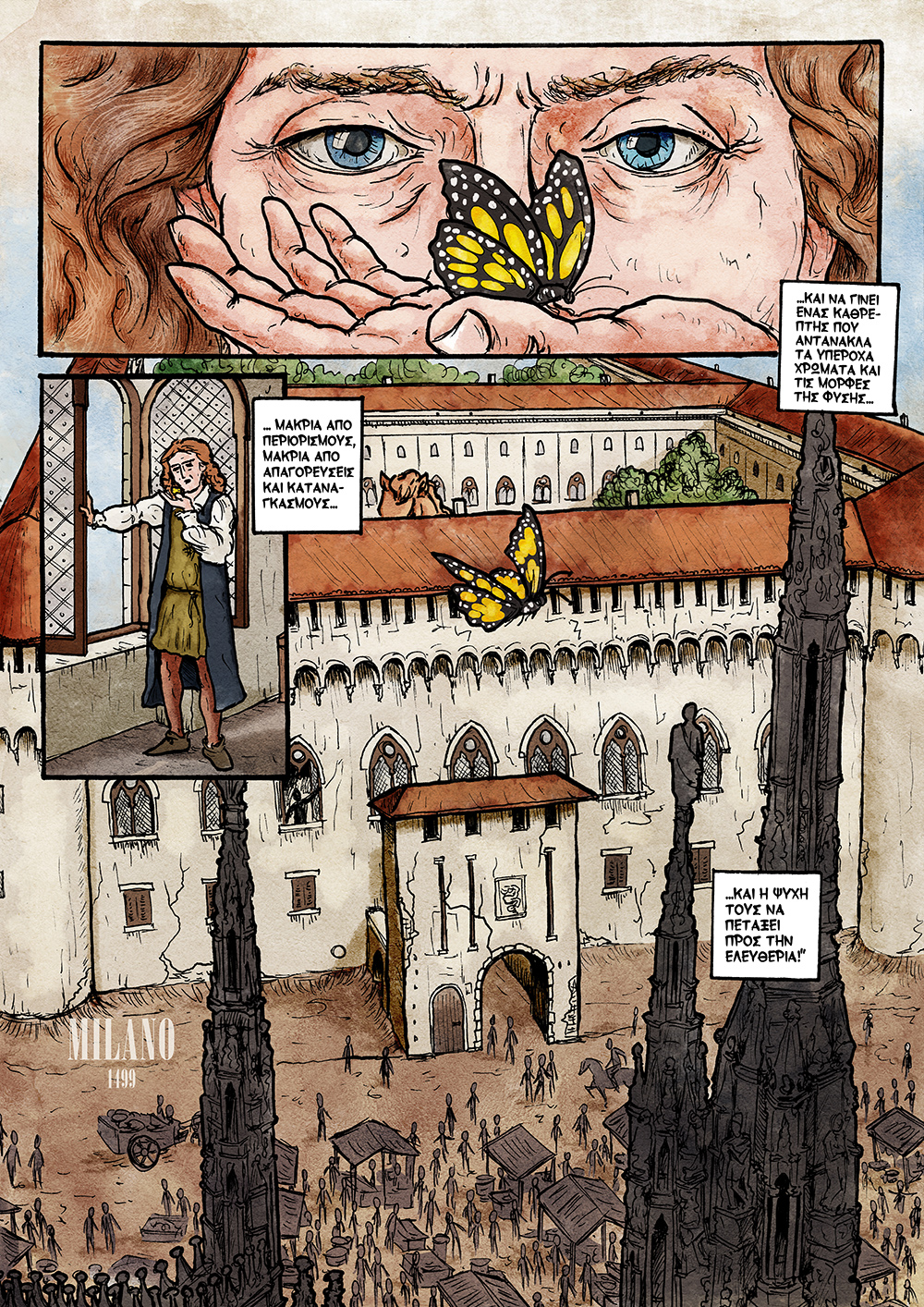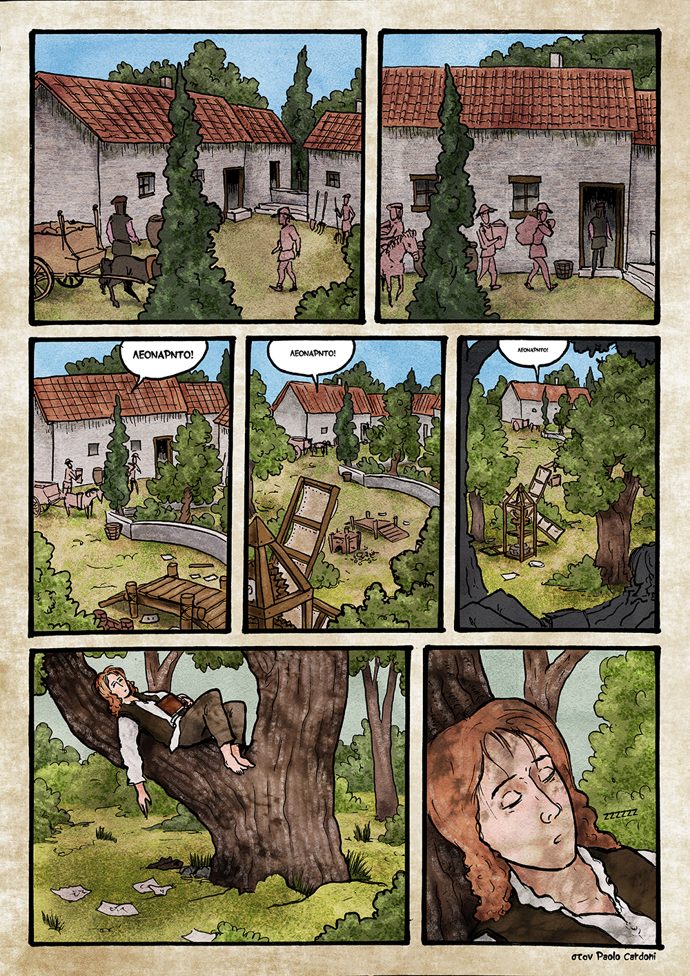 The original version was about Leonardo as a teenager trying to fly. Subsequently, I decided to expand the comic by covering the later years of Leonardo’s life and to enrich his dream of flying with dilemmas about his work. I settled on a three-part design, one based on the original Journey in the Air, the second in his mature years in Milan, and the last in his last days before he died in France.