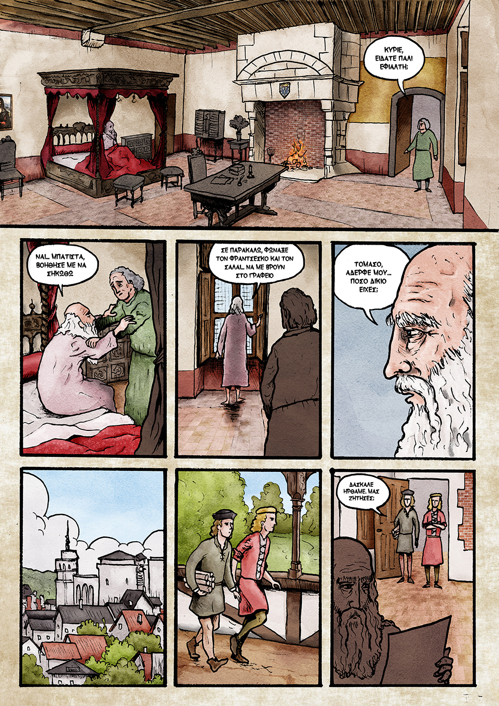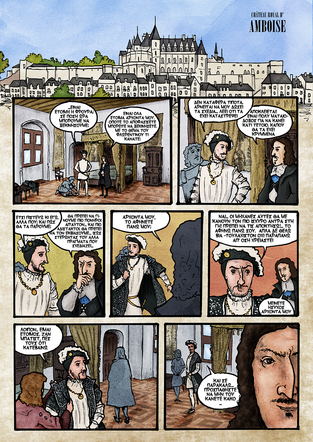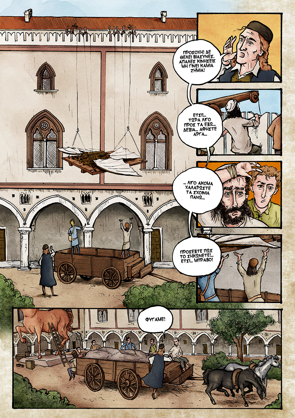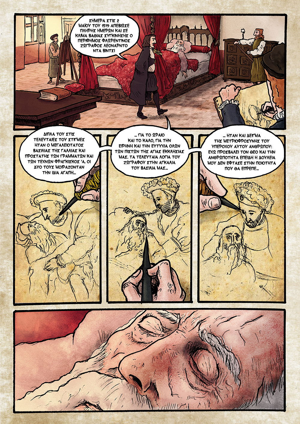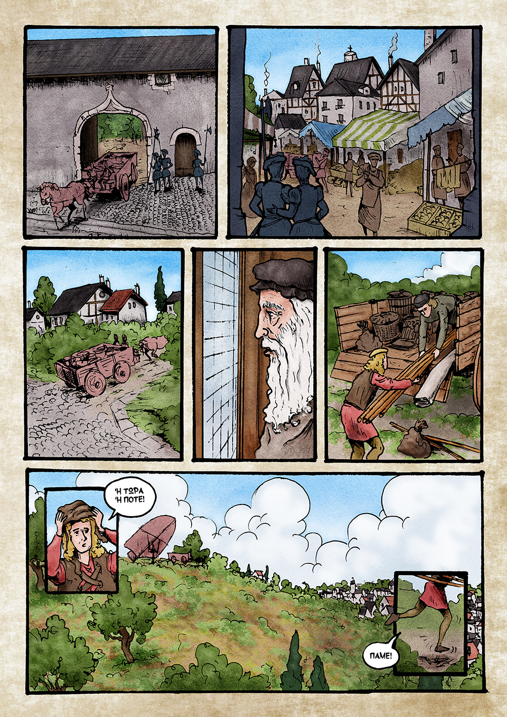 The original version was about Leonardo as a teenager trying to fly. Subsequently, I decided to expand the comic by covering the later years of Leonardo’s life and to enrich his dream of flying with dilemmas about his work. I settled on a three-part design, one based on the original Journey in the Air, the second in his mature years in Milan, and the last in his last days before he died in France.