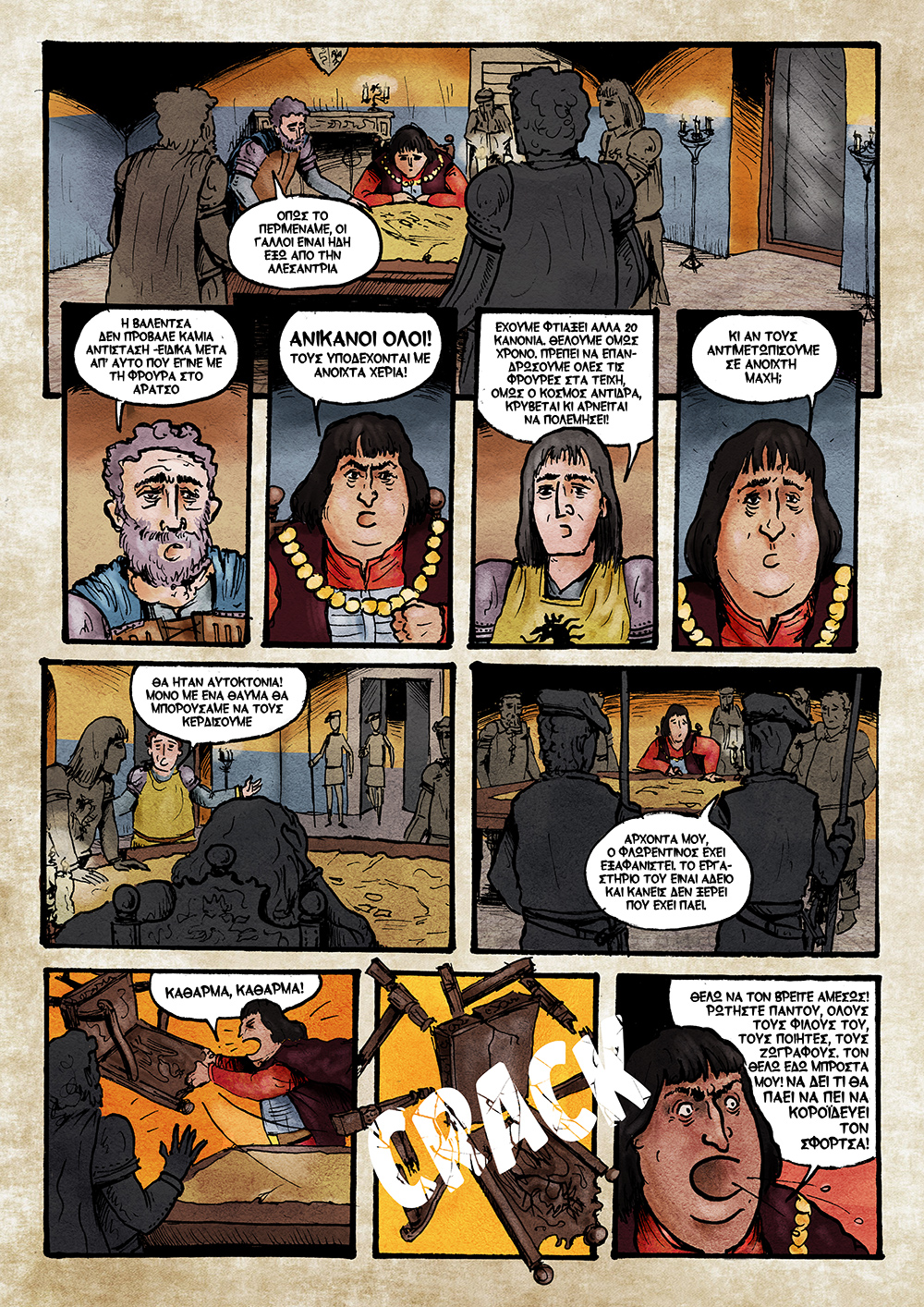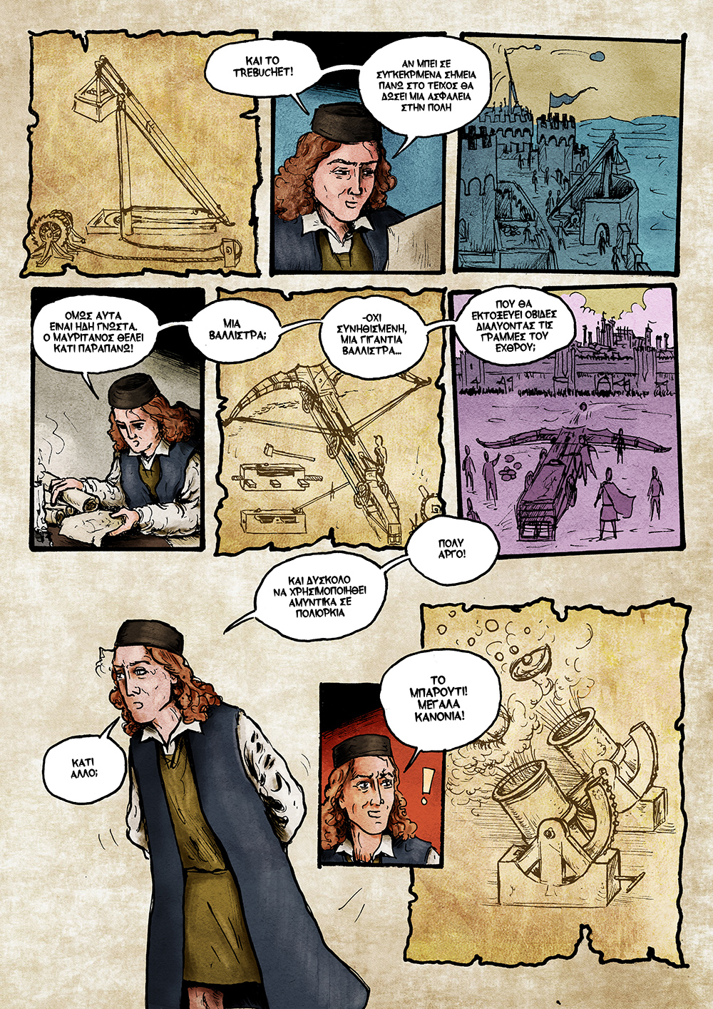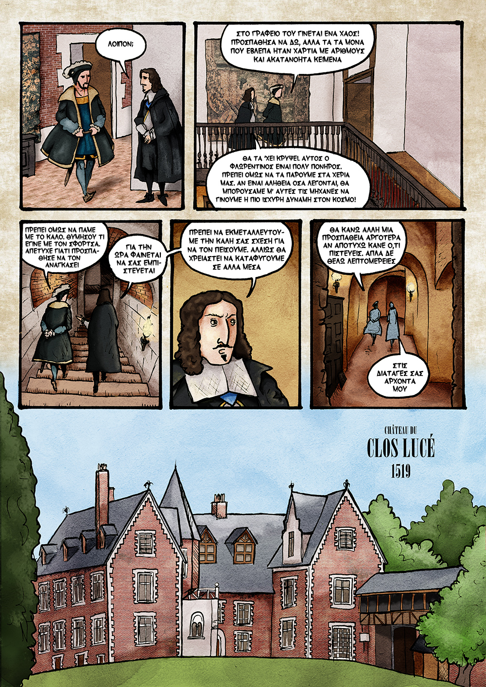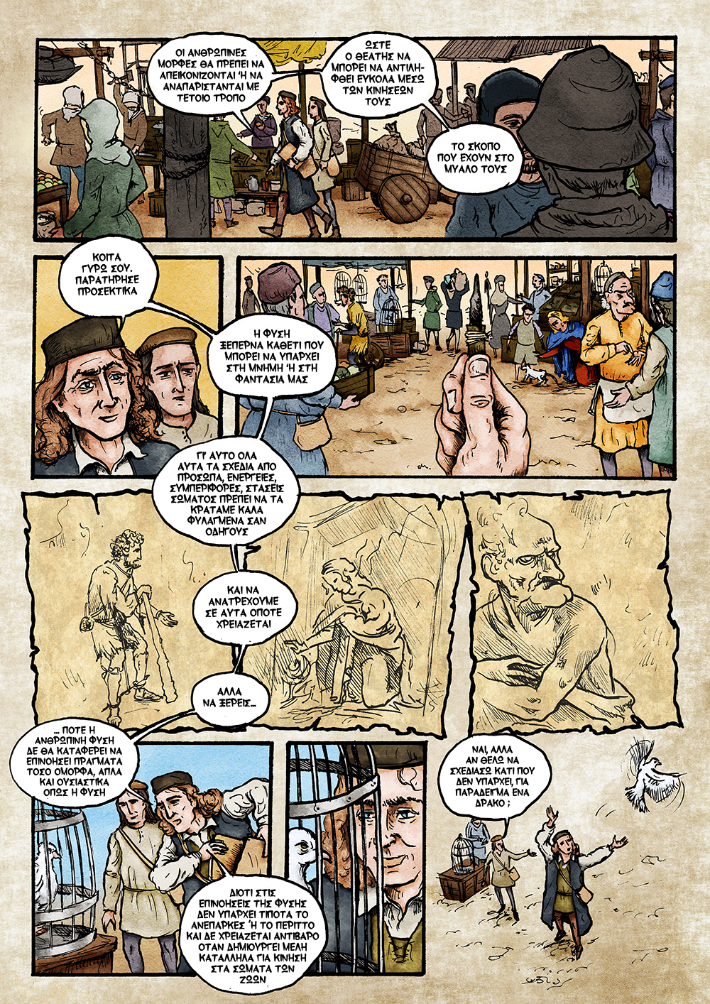 The original version was about Leonardo as a teenager trying to fly. Subsequently, I decided to expand the comic by covering the later years of Leonardo’s life and to enrich his dream of flying with dilemmas about his work. I settled on a three-part design, one based on the original Journey in the Air, the second in his mature years in Milan, and the last in his last days before he died in France.